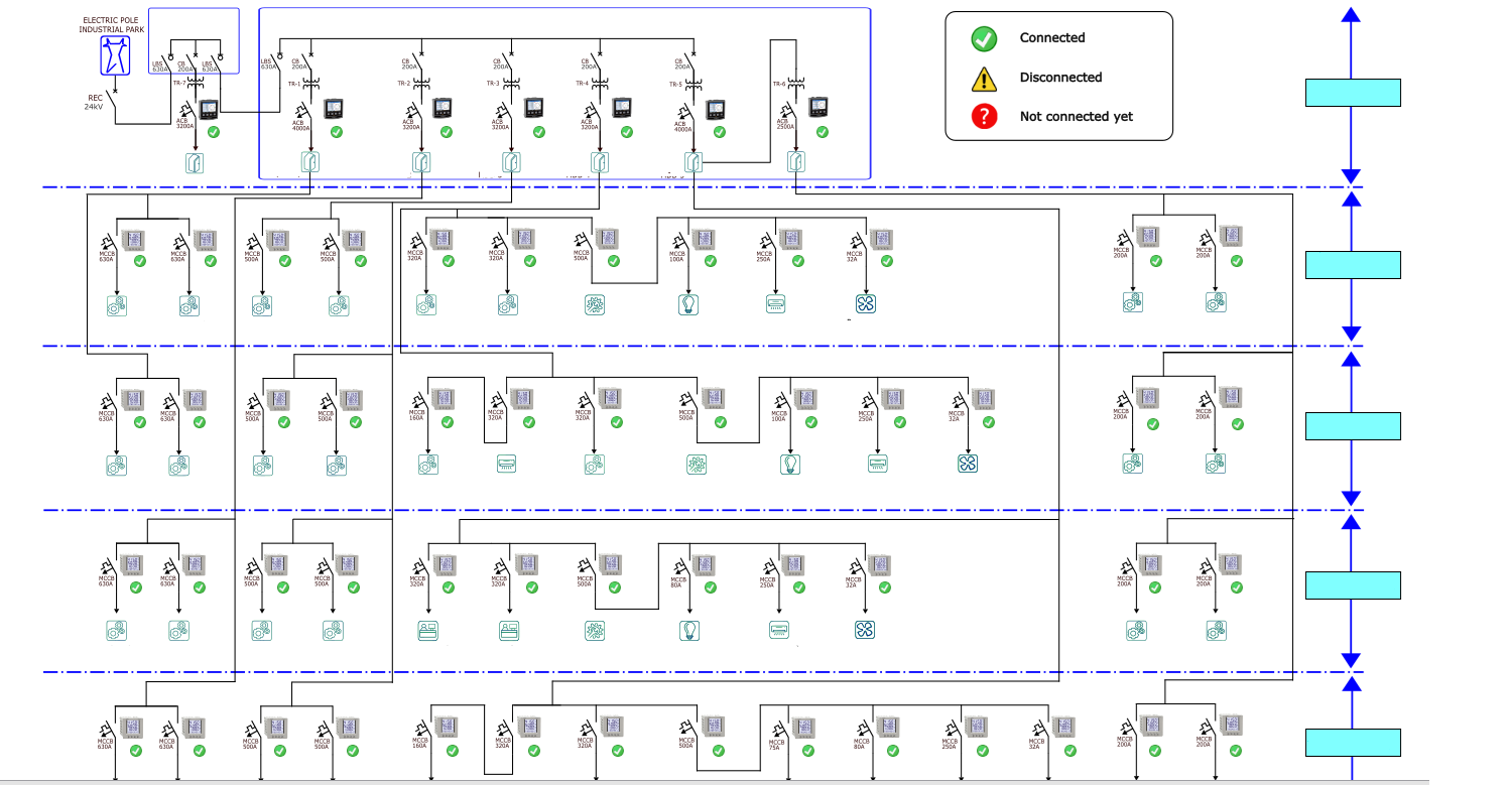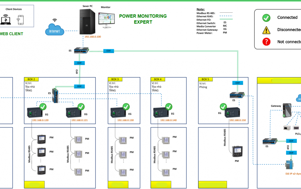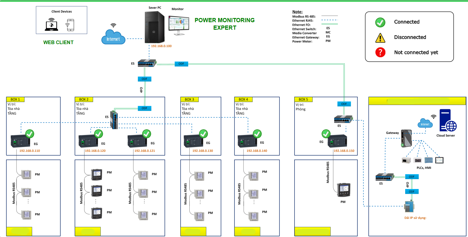 - Giai đoạn 1 (2024) Kết nối 55 đồng hồ đo công suất qua các Gateway và lưu trữ dữ liệu Server tại nhà máy, giám sát và quản lý hệ thống cung cấp năng lượng cho nhà máy qua phần mềm Power Monitoring Expert của hãng Schneider Electric.